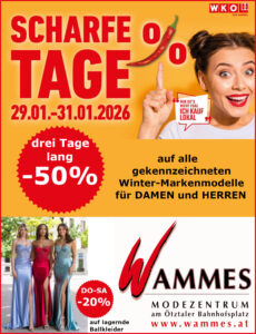 Es ist wieder soweit. Drei Tage lang sind alle gekennzeichneten Winter-Markenmodelle für Damen und Herren generell um -50% reduziert. Lagernde Ballkleider gibt es von Donnerstag bis Samstag um -20 %. Da ist sicher das eine oder andere Schnäppchen auch für Sie dabei. Wir freuen uns auf Ihren Besuch.